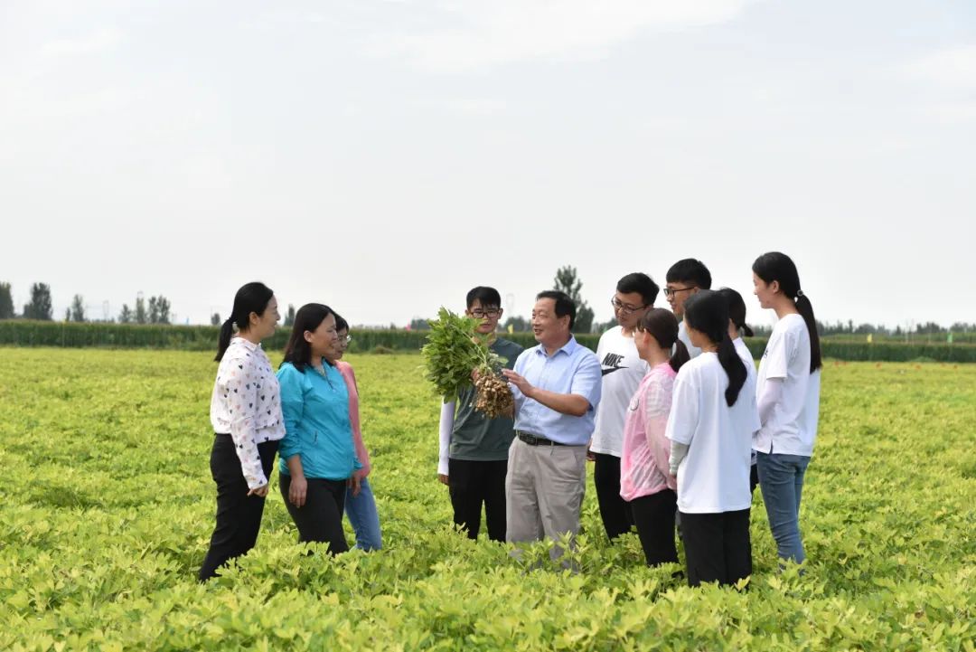 国家科技进步奖二等奖获得者、山东农业大学花生育种专家万勇善教授在田间与团队成员查看花生新品种生长状况。学校供图
