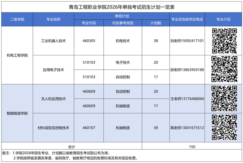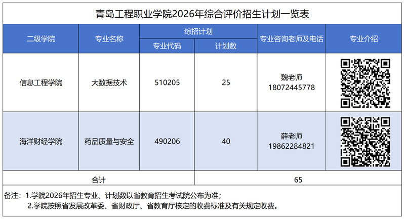 青岛工程职业学院2026年单独考试招生和综合评价招生总计划215人,其中单独考试招生计划150人,综合评价招生计划65人。